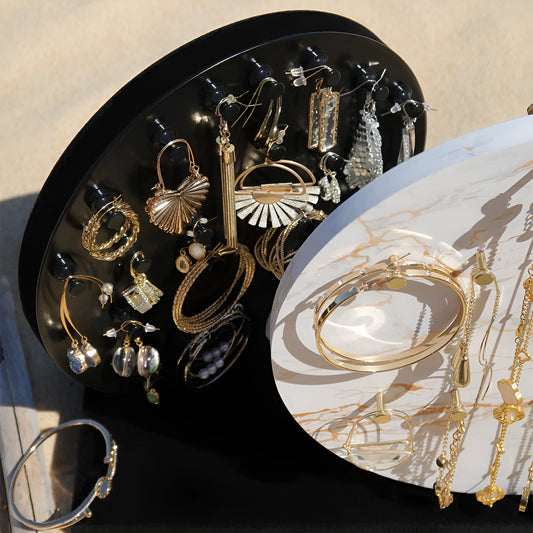 Introducing our innovative jewelry organizer—the ultimate solution for keeping your precious pieces beautifully arranged. This stylish and functional organizer features a ring insert, necklace stand, magnetic earring holder, and more, all designed for easy access and visibility. With its revolving design, you can effortlessly view and select your jewelry.